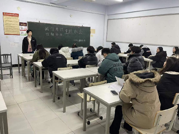 为严肃考风考纪,加强诚信教育,帮助我院同学进入复习状态﹐树立良好的考风、考纪,进一步规范学校考试工作,同进一步强调寒假假期安全等有关事宜12月15日下午,我院2020级辅导员张齐家卉组织各班开展了一次以“诚信考试、假期安全”的主题班会﹐同学们积极参与并为树立良好的考风、考纪提出了宝贵的意见。