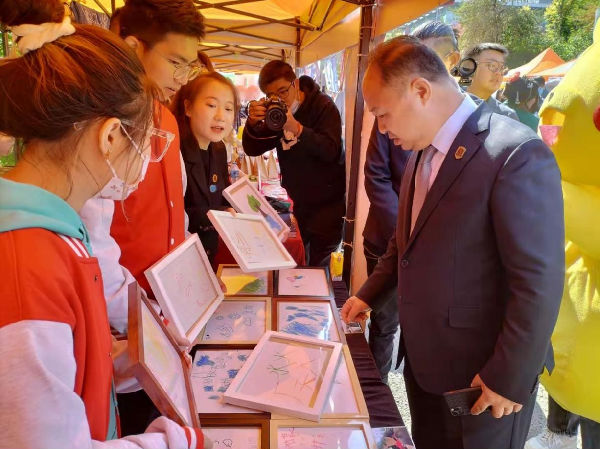 最让人眼前一亮的是我院团委学生会实践部的“星光义卖”,这是来自自闭症儿童亲手的作品,简单纯真,但却代表着他们内心的世界,或是开心,或是期待。来买他们作品的人有很多,熙熙攘攘,每个人都在寻找着打动他们内心的作品,非常治愈。这个展位也得到了董事长的赞许,他也亲手挑选了一幅作品;刘欣副董事长也对学院该实践活动给予了高度评价,并希望能够长期坚持下去,将大学生的爱心和奉献传递出去。