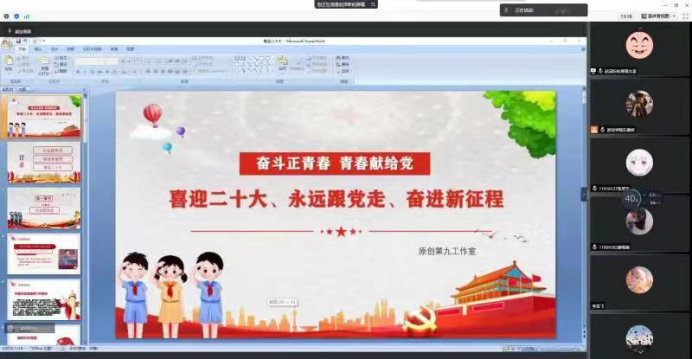 为迎接党的二十大,庆祝建团100周年,深入推进青年学生的思想引导,红黑游戏 各团支部于2022年4月30日以线上会议的方式举行并完成以“喜迎二十大,永远跟党走,奋进新征程”党的青年运动史主题团会。红黑游戏 认真组织,紧紧围绕本次团课的主题和内容展开讨论和学习,党的青年运动史中蕴含的宝贵精神财富,终将由我们青年一代来继承、发扬和坚持。