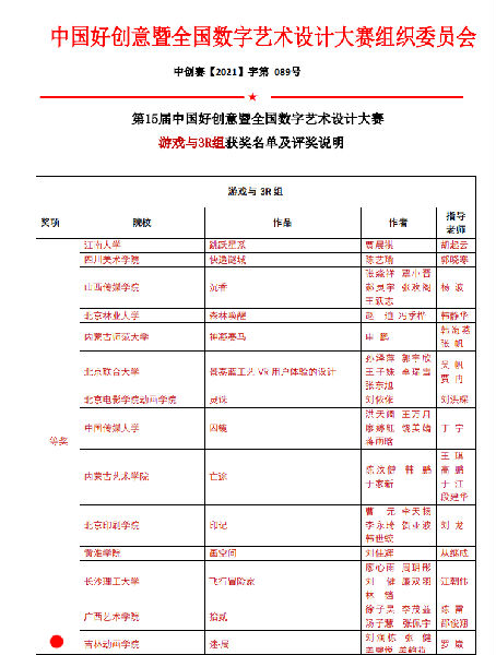 近日,第15届中国好创意暨全国数字艺术设计大赛落下帷幕。我院学子在报名参赛的游戏与3R组类别中,夺得一等奖1项、三等奖1项、优秀奖1项。